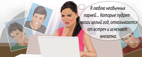 | Анастасия, нужно набраться смелости и признаться самой себе, что тебе нравится не конкретный человек, а его виртуальный «аватар». Ты знать не знаешь, каков он на самом деле. Ты не можешь гарантировать, что хотя бы смутно можешь угадать, как он выглядит, как говорит, какого возраста, профессии и даже семейного положения. Я тебе даже больше скажу: ты не можешь даже на 100% быть уверенной, что твой собеседник – мужчина, а не женщина. |  | Анастасия, боюсь тебя разочаровать, но невозможно влюбиться в того, кого ни разу не видела и даже не слышала. Физически не получится. Поэтому твои чувства и реальный человек, скрывающийся от встреч, не имеют ничего общего, ну, кроме одновременного существования в этом Мире. Всё, что ты переживаешь и чувствуешь – это проекция нереализованных желаний на выдуманный объект. |  |